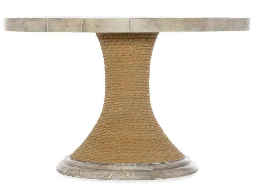 With a modern yet casual style, the Armani 48-inch Round Pedestal Dining Table is an eclectic mix of materials including Pecan Veneers with a rope-wrapped base. The Buff Almond finish is a serene lime washed tonal finish with subtle texture. Includes table top and base.