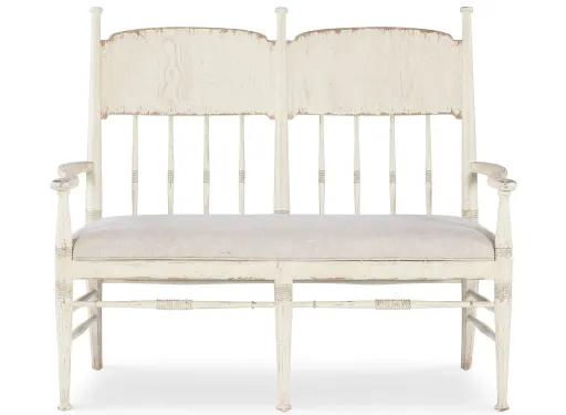 Americana Dining Bench has a nostalgic design including a spindle-style back with carved accents on the spindles and frame. The fabric seat is upholstered in the linen Biscuit performance fabric with welt trim. Crafted of Oak Veneers, the bench is finished in the time worn white Daisy finish, with the look of pieces passed down through the family over time and revealing the rich oak character beneath.