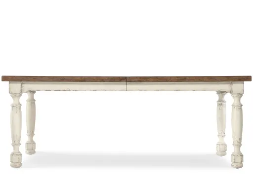 Combining the time worn white Daisy finish on the base and the warm Honey finish in a soft brown tone on the top, the Americana Dining Table harkens back to a simpler, more genteel time. Crafted of Oak Veneers with a Solid-Wood Edge Top, it has chunky turned legs and a shaped apron. What's more, this table can be a real crowd-pleaser. With the 22-inch leaf in place, it extends to 102 inches long, accommodating up to 4 coordinating benches and two armchairs or up to 8 coordinating arm or side chairs. Without the leaf, it accommodates up to 6 coordinating arm or side chairs and up to two coordinating benches and two armchairs.