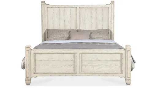 Reimagining a well-loved historical silhouette with a fresh take on finish, function and form, the inviting Americana Panel Bed has a planked motif on the headboard and footboard, scroll-work on the base of the footboard and caps on the bedposts. Crafted of oak veneers, it is finished in the timeworn white daisy representing the natural wear one might expect of pieces passed down through the family over time. Headboard can be used alone.