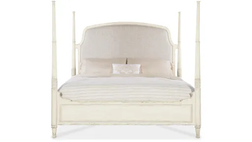 In a stunning reimagination of the classic Southern 4-poster bed, the inviting Americana Upholstered Poster Bed has an upholstered fabric headboard with welt trim, in a creamy white color complementing the timeworn white daisy finish over Cathedral oak veneers. There are carved accents on the posts and scroll work on the upper sides of the footboard. The footboard comes with capes for a low-post option.