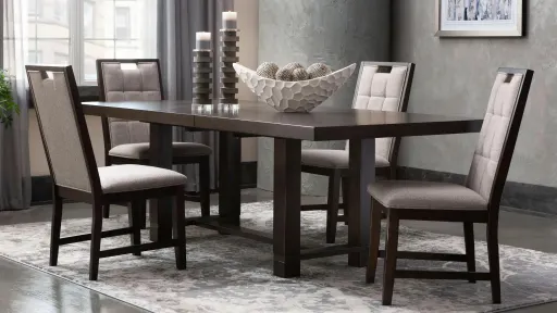 For a beautifully styled dining room, look to the Andell 5-pc. dining set. This fine collection features the latest trends like squared button-tufting and dark wood tones. And, with lovely gray upholstery, this set will look on-trend for years to come.