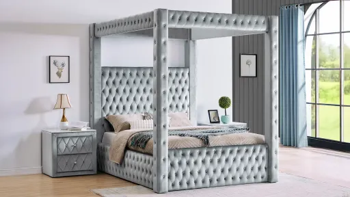 This striking Annabelle Canopy Bed combines bold modern design with luxurious details. Its sleek velvet frame exudes opulence, while the tufted velvet headboard and footboard provide a touch of plush elegance