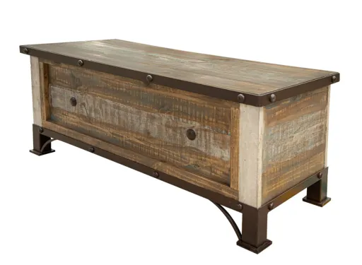 Add rustic charm to your bedroom with this lift top Antique Trunk. A hand distressed and wire brushed finish is applied over solid pine to give this piece a natural and attractive look. Store extra blankets, linens and more conveniently in your room with the large compartment. Completing the country inspired look are the hand forged iron details in the base trim and bold nail head details.