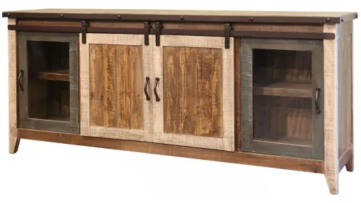 With a sliding doors, antique nail heads and a multicolor look, the details are the charm of the Antique 80" TV Console. This console will add a rustic finishing touch to your living space.