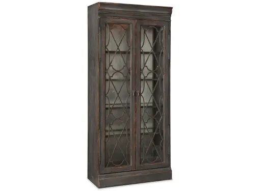 Add a stunning focal point to your home with the Arabella Bunching Display Cabinet, distinguished by two doors with seeded glass and lovely wood fretwork. Finished in a heavily painted charcoal, the display cabinet has a reversible faux shimmery eglomise back panel. As functional as it is fashionable, the cabinet has three adjustable wood-framed glass shelves and one fixed wood-framed glass shelf, along with a three-intensity touch switch light.