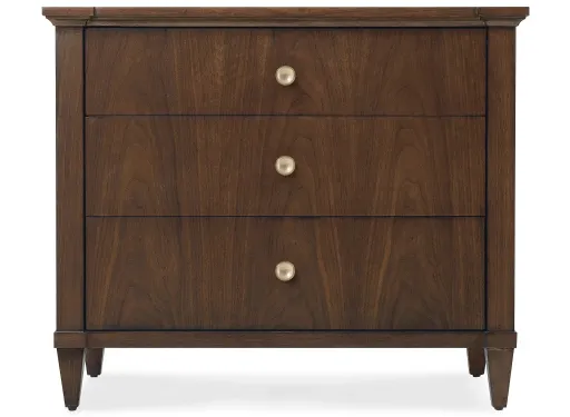 The Archives Three-Drawer Nightstand combines storage with sophisticated design. Crafted with figured walnut veneers and a Classic Walnut finish, this nightstand features three drawers, with an integrated charging station for modern convenience. The cedar-lined bottom drawer offers extra protection for your belongings, while the satin brass hardware adds a touch of luxury.