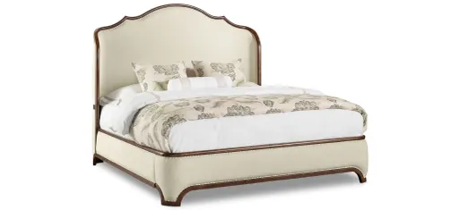 Exuding a larger-than-life ambience, the romantic Archivist King Upholstered Shelter Bed has shaped wood and upholstery tack trim around the upholstered headboard, rails and footboard. A statement piece of tasteful style, the graceful Archivist bed silhouette features a soft casual pecan-colored finish with a rustic character that contrasts beautifully with the Aubergine Linen cream-colored upholstery fabric.