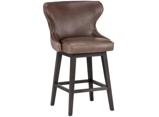 Ariana Swivel Counter Stool with elegant contours and a button tufted back with antique brass nail heads. Stocked in Havana dark brown and overcast grey faux leather with brown wood legs. Stretchers and a black metal footrest plate add durability. Also available in dark and light grey fabric. Suitable for various dining, kitchen and bar spaces of all sizes. Handle With Care: This design has been crafted with faux leather. Faux leather is manufactured to reflect the natural characteristics of leather; as such, color variations, markings wrinkles, grooves, and light scratches are appreciated characteristics.