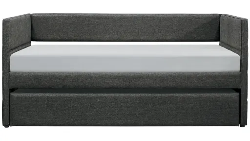 As a departure from the expected size of a twin bed, the Arie twin daybed with trundle provides an ample amount of sleep space within a defined area. From transitional to contemporary, the unfettered design of the daybed allows for placement in a number of home environments. The daybed is upholstered in a dark grey fabric, furthering the stylistic versatility. A twin size under-bed trundle pulls out to accommodate your additional sleep space needs