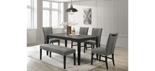 The Arlene 6-PC. Dining Table Set is a stylish and versatile piece of furniture that is perfect for any dining room. Constructed from durable rubberwood and upholstered seating, this table set is built to last and can withstand the wear and tear of everyday use. The table, chairs, and bench are finished in a sleek black color. The tufting to the chair backs add a special touch, giving it a unique and classic look. The transitional design of the Arlene set is perfect for those who prefer a blend of traditional and contemporary styles, making it a great addition to any dining room.