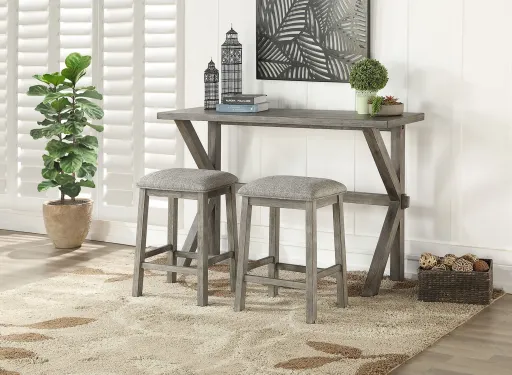 The design of the Armhurst dining set allows for this 3-pc. counter height table and barstools to tuck neatly against a wall, helping to create an open space within your casual dining area. Whether used as your primary dining spot or as an enhancement to your recreational room, the collection is a welcome space saver. The wire-brushed acacia veneer of the table and barstools is finished in grey for neutral accent to your home. The neutral tone of the linen-like padded seats of the two barstools further complements your space.