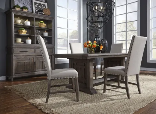 Anchor your dining room in a rustic-inspired modern farmhouse with this Artisan Prairie 5-piece trestle dining set. This set features a table with leaf and four chairs, it has everything to set the scene for your meal gatherings right. The rectangular tabletop is finessed, while the chairs are tailored with the most comfortable seating.