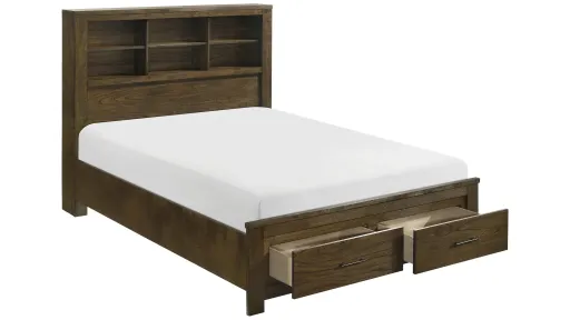 The Arya Platform Bed with Storage provides ample drawers and shelves to achieve your desired bedroom design. The bed's headboard features bookcase shelving, allowing for open display, and the drawers of the footboard allow for under-bed storage. The wire-brushed oak finish over mindy veneer lends subtle rustic aesthetic to the collection while dark brown metal bar hardware provides complementing accent to the drawer fronts of the storage footboard drawers.