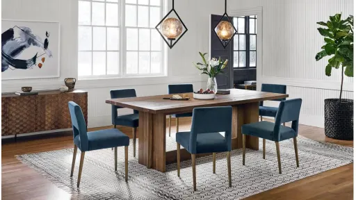 The Ashford Upholstered Dining Chair is slimly styled and mid-century minded. Velvety teal upholstery features a posterior cutout for added flair. Toasted nettlewood legs offer natural contrast.