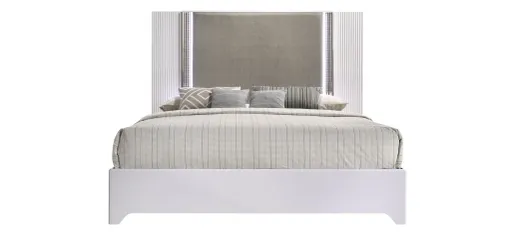 Elegant styling and a sleek exciting design are the details of the Aspen King Bed. This contemporary Bed is available in dominant white with complementary ridge trim detail, which together create a smart and sophisticated look that will enhance many room settings/décor choices. Additional features include Led and Upholstered headboard design. Tapered panel style legs that continue the versatile and delightful visual aesthetic of this bed. Quality craftsmanship in every detail ensures durability and long-lasting wear. The bed is the perfect choice to update your bedroom and create a sanctuary of comfortable and inviting relaxation for your home for years to come. LED lighting.