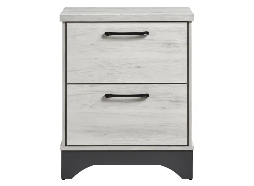 Enhance your bedside with this chic and functional Aspen Nightstand, featuring a contemporary two-tone white oak and gray finish. Crafted from a durable blend of lamination paper, wood, and engineered wood, this piece offers a modern aesthetic with lasting stability. It boasts two spacious drawers that glide effortlessly on smooth ball-bearing glides, providing convenient storage for your nighttime essentials. Each drawer is accented with sleek black-tone bar pulls, adding a touch of modern sophistication to its design. Best of all, this nightstand arrives fully assembled, allowing you to instantly elevate your bedroom with its clean lines and practical features without any setup hassle.