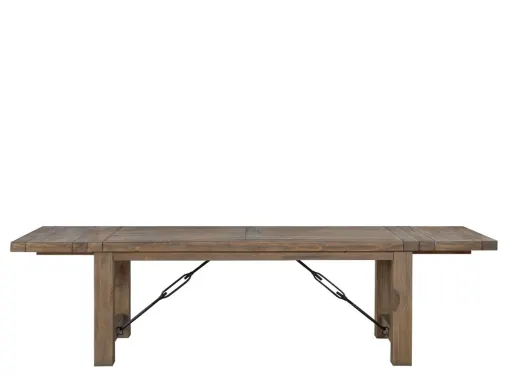 With all-solid wood construction, clean lines and functional appeal, the Autumn Dining Table with Leaf replicates the look of historical farmhouse with the warm appearance of reclaimed wood. Thick, naturally rough-hewn planks of solid pine form the table top with cast iron tension rods and cross-bracing providing a durable industrial-style foundation.