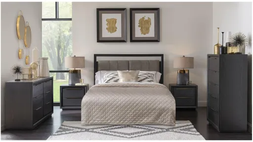 The Avery Queen Platform Bed features plenty of modern style. The light beige fabric on the headboard pops against a smooth black finish. Scaled perfectly for smaller bedrooms or guestrooms, this contemporary bed is inviting and stunning.