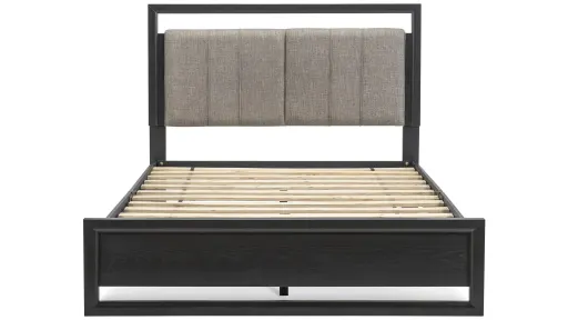 The Avery Queen Platform Bed features plenty of modern style. The light beige fabric on the headboard pops against a smooth black finish. Scaled perfectly for smaller bedrooms or guestrooms, this contemporary bed is inviting and stunning.