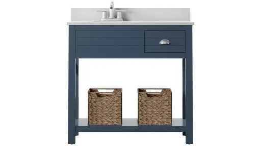 This Avon 36" Bathroom Vanity features an open concept design for on trend modern farmhouse style. The upper drawer is ideal for stowing smaller items such as your toothpaste, shaver, hairbrush, and more. An open lower shelf is the perfect spot for placing extra towels or decorative accents. Two woven storage baskets are also included for use on the lower shelf to give you the option of more modest storage. The vanity includes a white stone top, undermount basin, and an optional backsplash for a sleek, fully finished look.