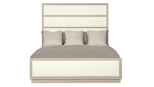 The Axiom upholstered panel bed offers clean lines and a sleek form, yet the feel remains warm and inviting. Giving the piece a distinctly modern slant, the high headboard features four upholstered, inset horizontal panels. Engineered faux veneers are presented in a silky yet low-sheen Linear Gray finish, while the neutral tone of the fabric keeps the look clean and balanced.