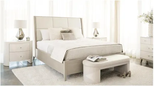 The Axiom upholstered panel bed offers clean lines and a sleek form, yet the feel remains warm and inviting. Providing comfortable support and modern flair, the winged headboard features six inset upholstered panels in a grid pattern. Engineered faux veneers are presented in a silky yet low-sheen Linear Gray finish, while the neutral tone of the fabric keeps the look clean and balanced.