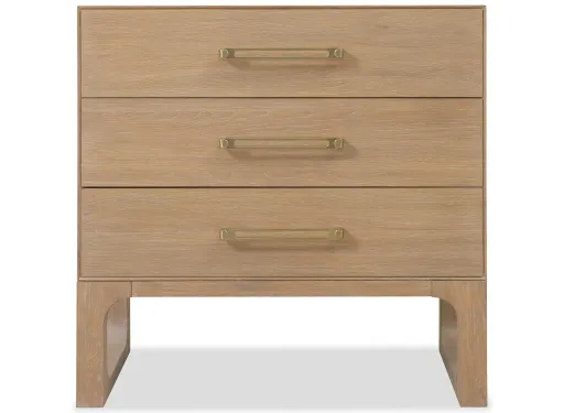 The Banyon Bay Three Drawer Nightstand brings functionality and style to your bedside. Constructed from white oak solids and oak veneers with a light Desert Oak finish, it features wire-brushing and cerusing for a textured appearance. The brushed brass stainless steel bar hardware adds a modern touch. With three spacious drawers, an integrated charging station, and a USB port, this nightstand is both practical and stylish. It is the perfect companion for contemporary bedrooms, blending sleek design with natural materials.