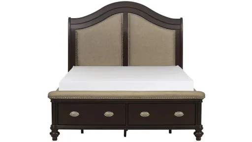 Refined elegance is exemplified in the design of the Bay City queen storage bed. Blending classic design elements to create a warm and welcoming bedroom. This piece features turned feet and high polished oval bale pull hardware. The neutral toned fabric inserts of the headboard and the padded footboard rail feature nailhead accents. Drawer storage features prominently on the footboard, offering that extra functional space that you need. The classic dark cherry finish further lends to the modern traditional look of the Bay City bed.