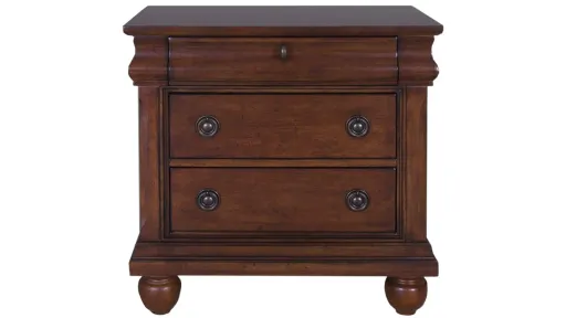The Bayberry nightstand is the heirloom quality Louis Philippe design with a burnished, rasped, rustic cherry finish. It fits right in with the more casual feel of today's bedroom and this is mostly achieved through well-worn, rustic finishes. Featuring chamfered pilasters, bun feet, drop ring and key hardware in an antique brass.