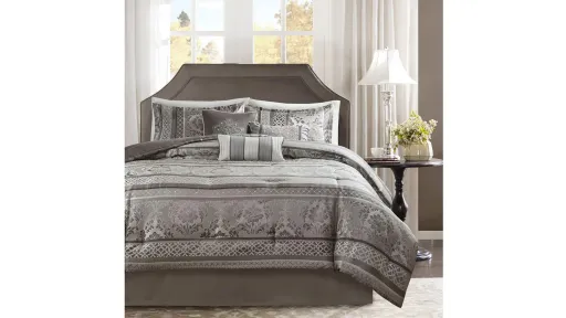 To add a touch of richness to your current decor, the Bellagio 7 Piece Comforter Set offers a luxurious update to your room. Made from polyester jacquard, the comforter and shams share leaf, striping and ironwork motifs that are accentuated by elegant stitching. Pops of silver are also used throughout this collection adding a lavish feeling to your decor. Three decorative pillows feature pleating and embroidery details that correspond back to the comforter, while a rich bed skirt helps bring the entire look together.