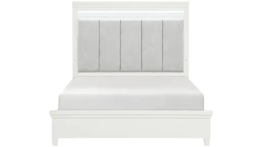 Elegance is beautifully captured in the design of the Bellamy Bed. Velvet fabric upholstery covers the panel headboard, with LED backlighting providing dramatic illumination to the collection's design. Inset faux crystal banding provides accent to each piece of the collection creating a reflective glow against the white finish.