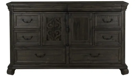 Warm and inviting the Bellamy bedroom dresser welcomes with European inspired styling in a unique peppercorn finish and matte black pewter accented hardware. Scrolling woodwork adorns the dresser doors, the dresser has a roomy intereor and features rounded corners atop rounded bun feet. It offers gorgeous, sumptuous scrolled design work for a chateau feel for any taste.