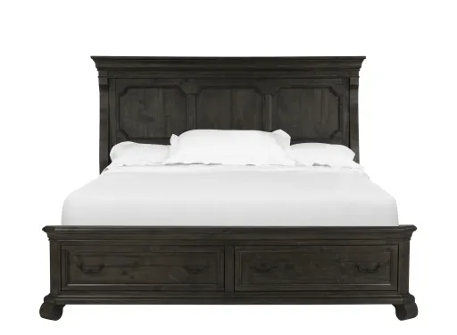 Warm and inviting the Bellamy California king panel storage bed welcomes with European inspired styling in a unique peppercorn finish and matte black pewter accented hardware. Woodwork adorns this bed, it also features rounded corners atop rounded bun feet. This bed offers a storage footboard and a gorgeous panel headboard with sumptuous design work for a chateau feel for any taste.