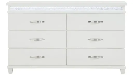 Elegance is beautifully captured in the design of the Bellamy Dresser. Inset faux crystal banding provides accent to each piece of the collection creating a reflective glow against the white finish. Polished chrome bar hardware fronts each drawer face of the nightstand.