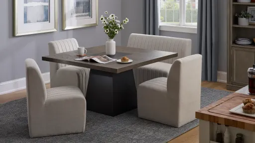 Enjoy modern dining with the Benedict 5-pc. dining set: it’s perfectly styled and extraordinarily versatile. The square pedestal table anchors this set with a bold geometric base and a spacious top, while sleek upholstered banquette seating delivers a tailored look with channel-tufted upholstery that’s both sophisticated and inviting. Armless side chairs with casters can be seamlessly stowed beneath the table for a neat, compact look when not in use. Set includes dining table, three side chairs, and one dining bench.