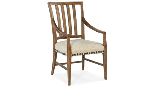 Inspired by the natural beauty of the American wilderness, the Big Sky Arm Chair has a stylized spindle back, shaped wood arms, legs, and 3 stretchers finished in vintage natural.