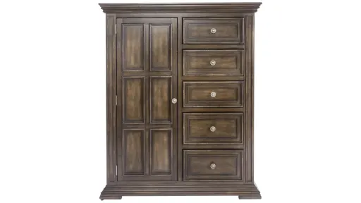 Combine todays modern lifestyle and traditional past with the Big Valley Door Chest. Crafted with rubberwood solids and birch veneers, this piece features 5 drawers and 1 door, bottom case dust proofing and fully stained interior drawers. The door opens to reveal 3 adjustable shelves, perfect for user customization.
