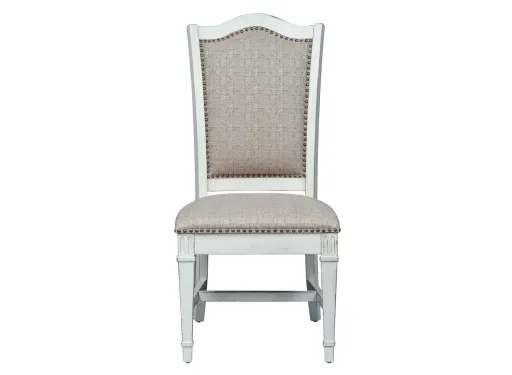 Blending of European traditional design influences makes the Birmingham upholstered side chair a truly unique style for any living space. Warm antique finishes and artistic distressing along with grand scale makes the Birmingham chair a piece to be passed to generations. The antique white finish with heavy chipping creates a truly unique look.