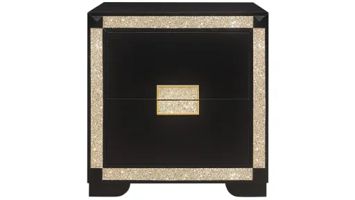 The Blake Nightstand combines style and elegance with many beautiful features. The nightstand is outlined with gold colored crushed crystal to highlight its unique design. The matching Bed and additional Case sold separately pieces only enhance the elegant look of this piece. functionality, Style and quality are the staples of this nightstand. finished off with the crushed gold crystal outline complemented by the black and gold hardware.