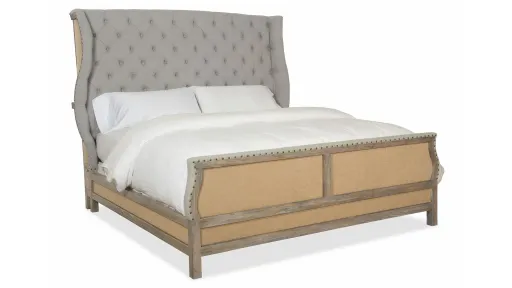 Inspired by the Belgian design aesthetic, the Boheme De-Constructed King Bed combines a button tufted soft gray linen upholstered shelter headboard with a footboard, back and sides that pair linen and burlap for a sophisticated rustic appeal. The finish is Antique Milk, a light brown with a nearly opaque antique milk color and a brush-painted effect. Bed includes headboard, footboard and rails.