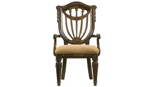 Make a statement in your traditional decor with the Bradford Heights armchair. The stunning beauty of this formal dining piece is something you'll cherish every time you sit down. Mixing old world grandeur with the comfort of upholstered seats, this piece is sure to delight family and friends for any gathering. Cathedral pattern veneers, two-tone finish and intricate wood carvings complete this classic look.