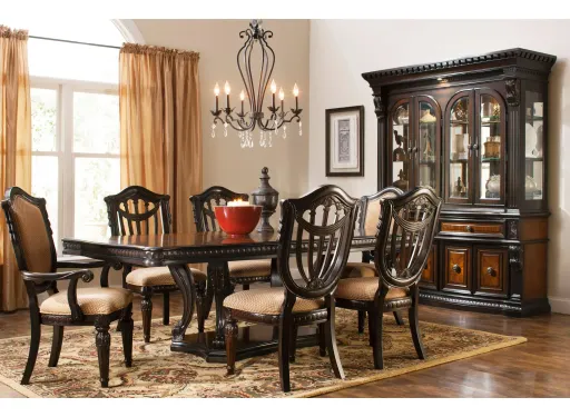 Make a statement in your traditional decor with the Bradford Heights 7-pc. dining set. The stunning beauty of this formal dining set is something you'll cherish every time you sit down for a meal. Mixing old world grandeur with the comfort of upholstered seats, this group is sure to delight family and friends for any gathering. Cathedral pattern veneers, two-tone finish and intricate wood carvings complete this classic look.