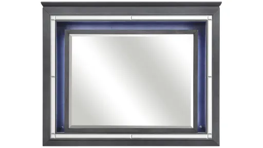 Glamour reigns in the design of the Brambley bedroom mirror. Framed by a decorative beveled mirror accent that enhances the illumination. Alligator embossing and high polished crystal elevates hardware boldly accent the finish - over mindy veneer - of the collection, providing additional glamour and functionality to your bedroom featuring an added hint of sparkle.