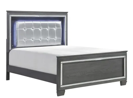 Glamour reigns in the design of the Brambley California King bed. Each piece is framing a decorative beveled mirror accent that enhances the illumination from the touch-engaged LED back-light of the headboard and mirror, as well as the under-light of the night stand. Alligator embossing and high polished crystal elevates hardware boldly accent the finish - over mindy veneer - of the collection.