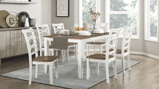 Breaux 7-pc. Dining Set lends timeless accent to your dining space while creating a gathering spot for your family's mealtime. The leg table and side chairs are conveniently packaged together and feature a white and cherry two-tone finish over acacia solid wood. The side chair's double x-back design and wood seat further lend to the casual country aesthetic.
