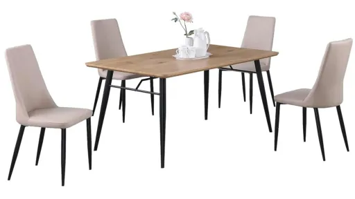 This Bridget 5-pc. Dining Set features a solid wood tabletop finished in oak, set upon a tapered leg base. Four side chairs with beige faux leather upholstery and matching-style tapered legs complete the collection.