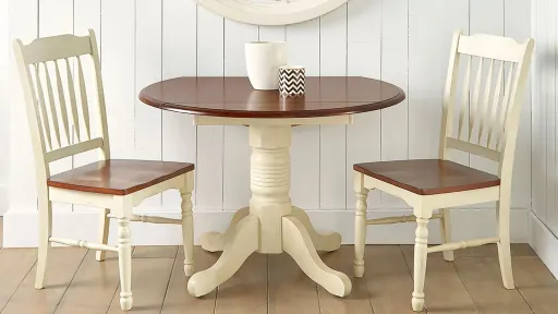 The British Isles 3-pc. round double drop-leaf slatback dining set is constructed of solid Rubberwood and designed with traditional country appeal. The 42" round double drop-leaf table is perfect for small dining spaces. The slatback side chairs have stretchers for added stability along with contoured solid Rubberwood seats.