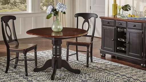 The British Isles 3-pc. round napoleon dining set with drop-leaves is constructed of solid Rubberwood and designed with traditional country appeal. The 42" round double drop-leaf table is perfect for small dining spaces. The Napoleon side chairs have stretchers for added stability along with contoured solid Rubberwood seats.
