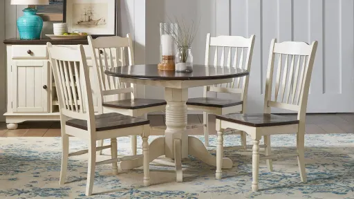 The British Isles 5-pc. slatback drop-leaf dining set is constructed of solid Rubberwood and designed with traditional country appeal.